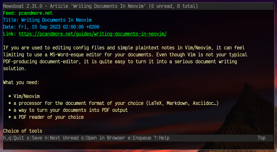 For normal content consumption, using RSS removes the For-You-Pages, the content recommendations and even the ads. This makes it easier to consume more mindfully, since you bypass the algorithms. Feed readers come in different forms. The one I use on my desktop is a terminal based reader called newsboat. Below you can see what it looks like. There are graphical readers too, but I like being able to pull up my reader on the terminal.