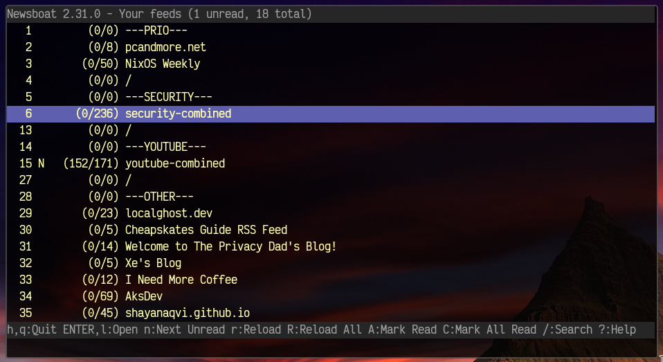 For normal content consumption, using RSS removes the For-You-Pages, the content recommendations and even the ads. This makes it easier to consume more mindfully, since you bypass the algorithms. Feed readers come in different forms. The one I use on my desktop is a terminal based reader called newsboat. Below you can see what it looks like. There are graphical readers too, but I like being able to pull up my reader on the terminal.